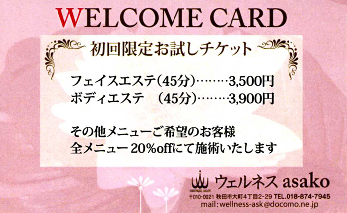 ウエルネスasako(あさこ)秋田県秋田市大町4丁目にあるエステティックサロンウエルネスasako(あさこ)。エステ、ブライダル、メイキャップ、体内エステ、リラクゼーション、美肌ケア。