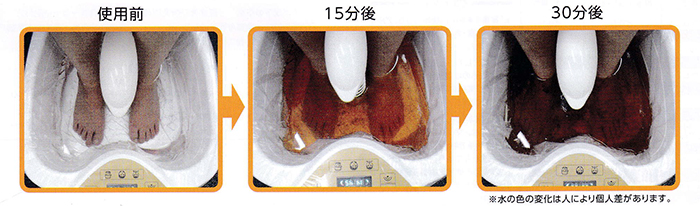超還元水(活性水素水)を使ったデトックスフットバス。 水の色の変化は、その人のその日の体調・生活習慣の通りに様々に現れます。 冷え性や代謝機能の低下でお悩みの方にオススメ。 |